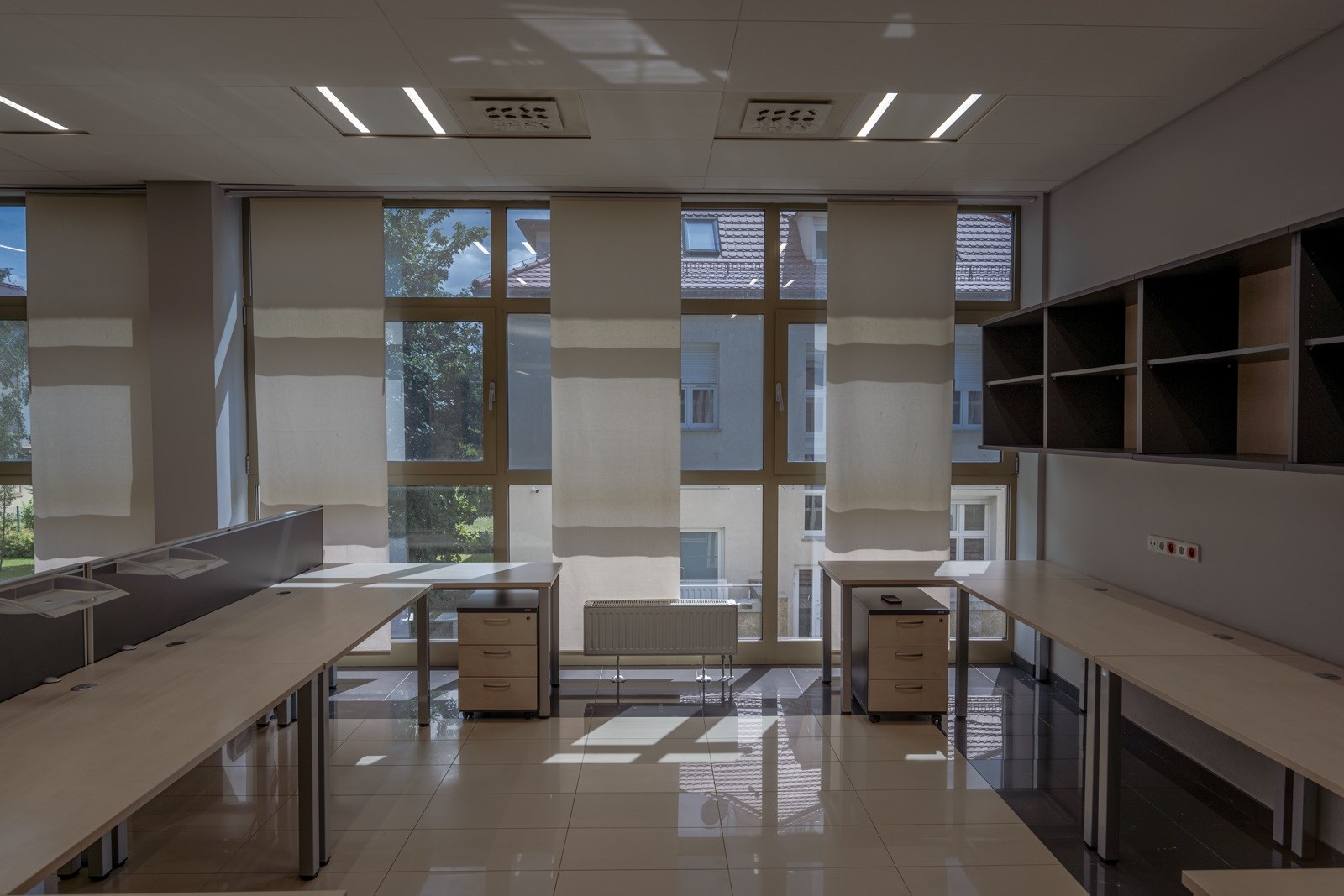 Naturalne Doświetlenie: Duże, otwarte okna typu sufit-podłoga gwarantują doskonałe doświetlenie naturalnym światłem, tworząc przyjazne i inspirujące środowisko pracy.