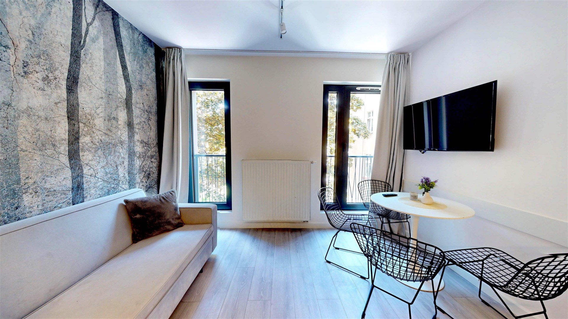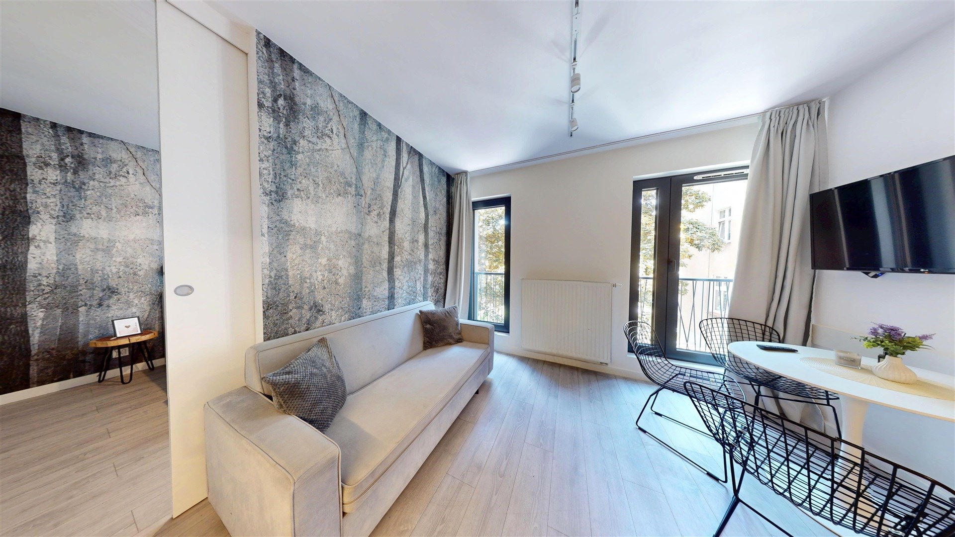 Choć formalnie to studio, jego układ zapewnia funkcjonalność mieszkania dwupokojowego – z wyraźnie wydzieloną częścią dzienną i sypialnianą. Dzięki temu wnętrze pozostaje przytulne, a zarazem praktyczne i łatwe do aranżacji.