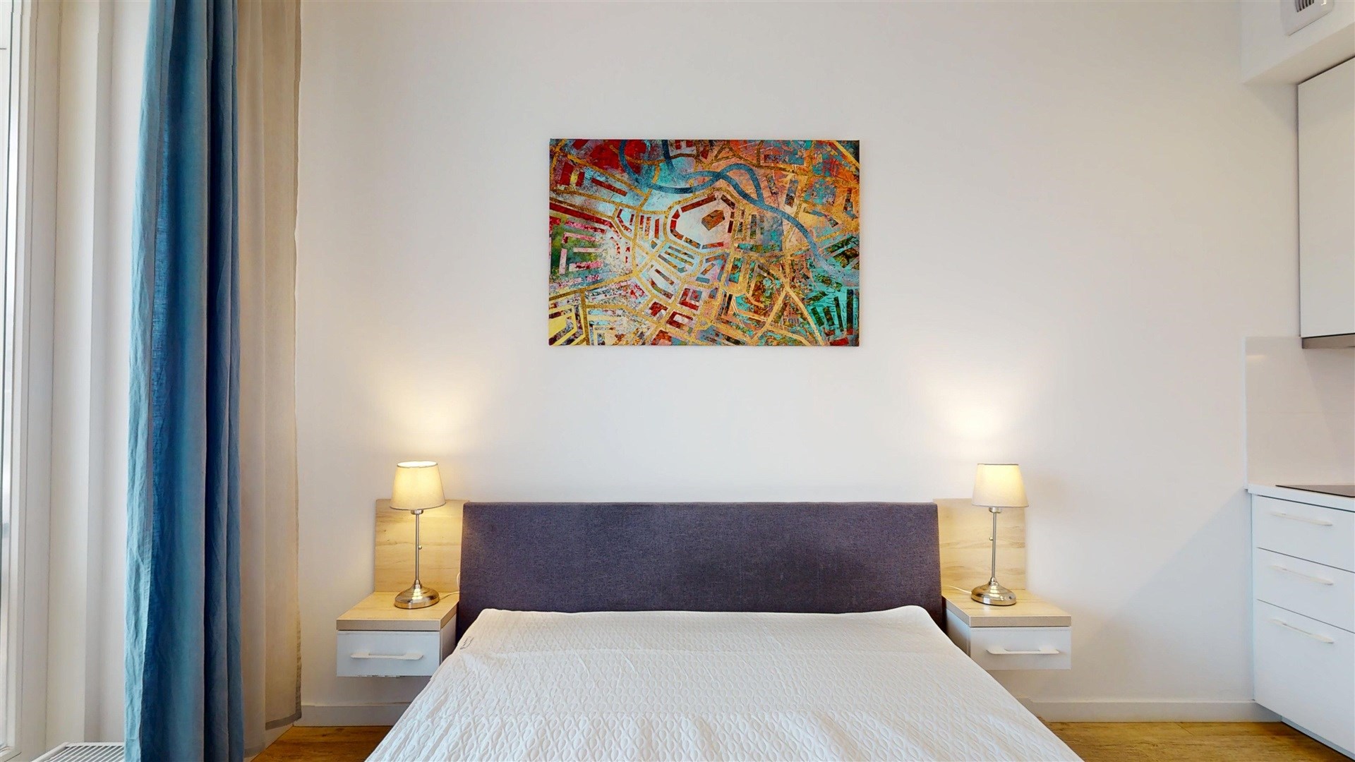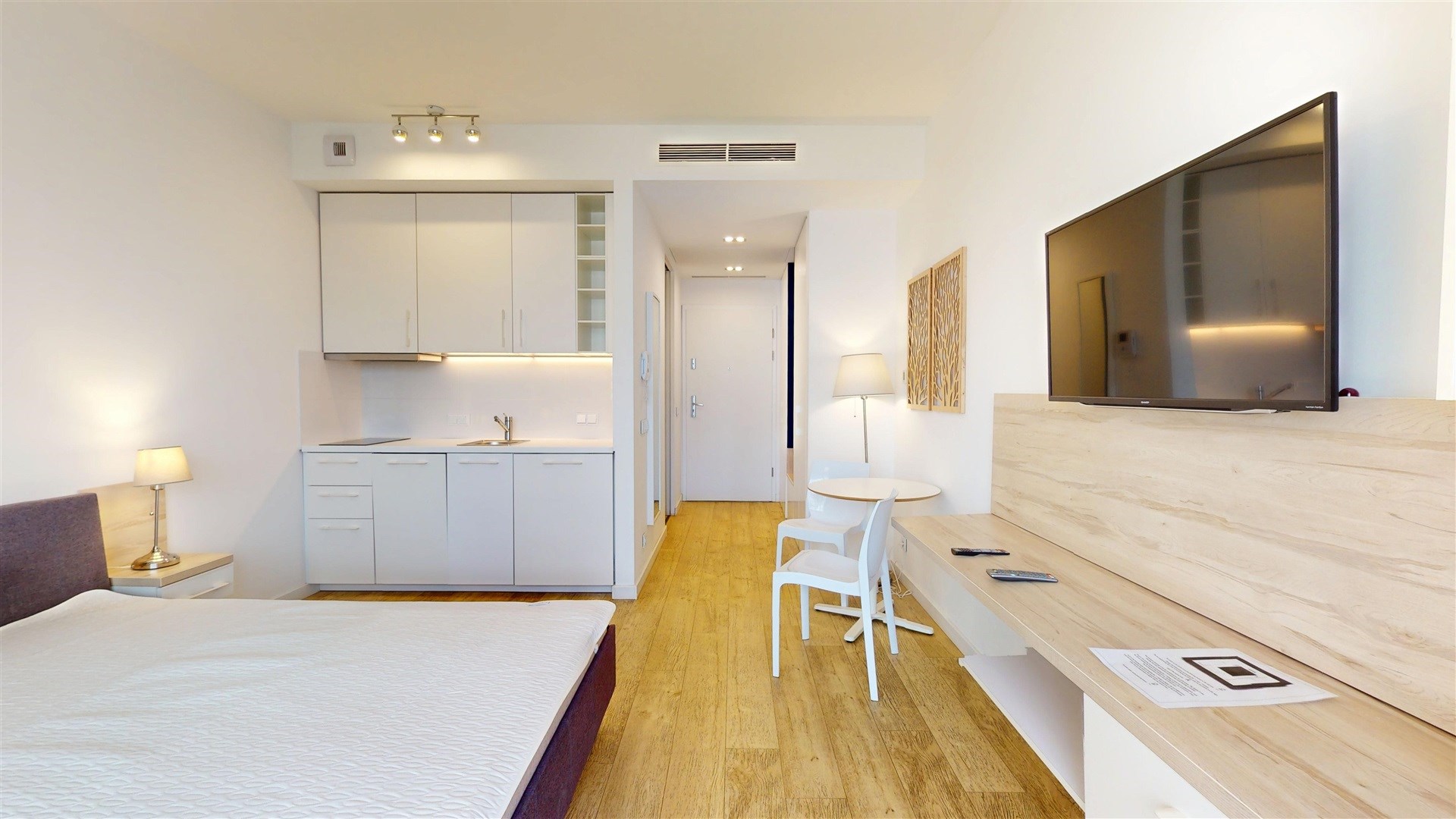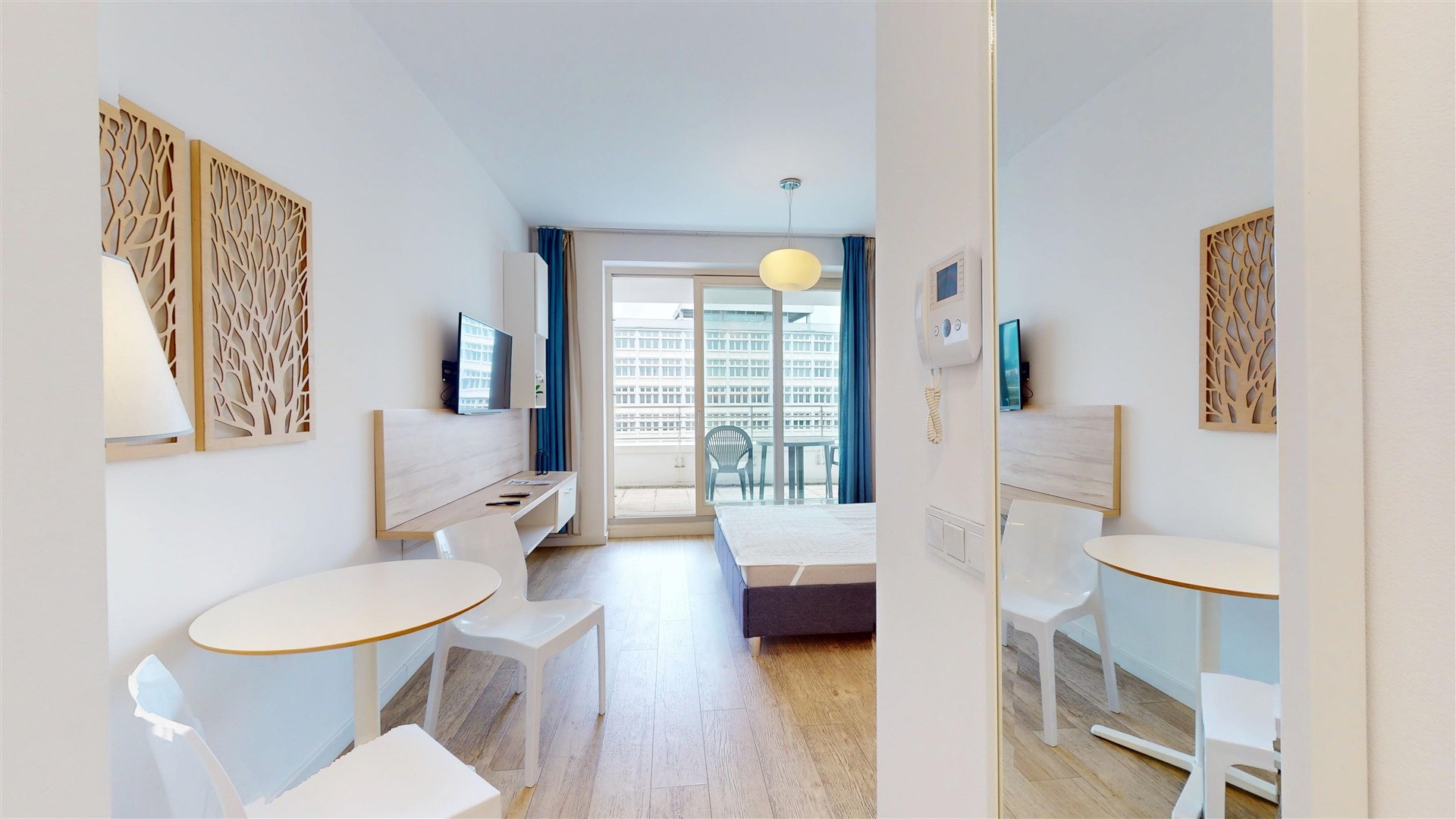 Mieszkanie maksymalnie wykorzystuje przestrzeń dzięki otwartemu układowi. Główna część łączy funkcję sypialni, salonu i aneksu kuchennego. Jasne drewniane podłogi i białe ściany nadają wnętrzu poczucie lekkości i przestronności. Z balkonu roztacza się widok na miasto, a niebieskie zasłony dodają wnętrzu charakteru. Kompaktowa kuchnia wyposażona jest w białą zabudowę i nowoczesny sprzęt AGD. Łazienka, choć niewielka, wykończona została w drewnianej tonacji i wyposażona w nowoczesne armatury.